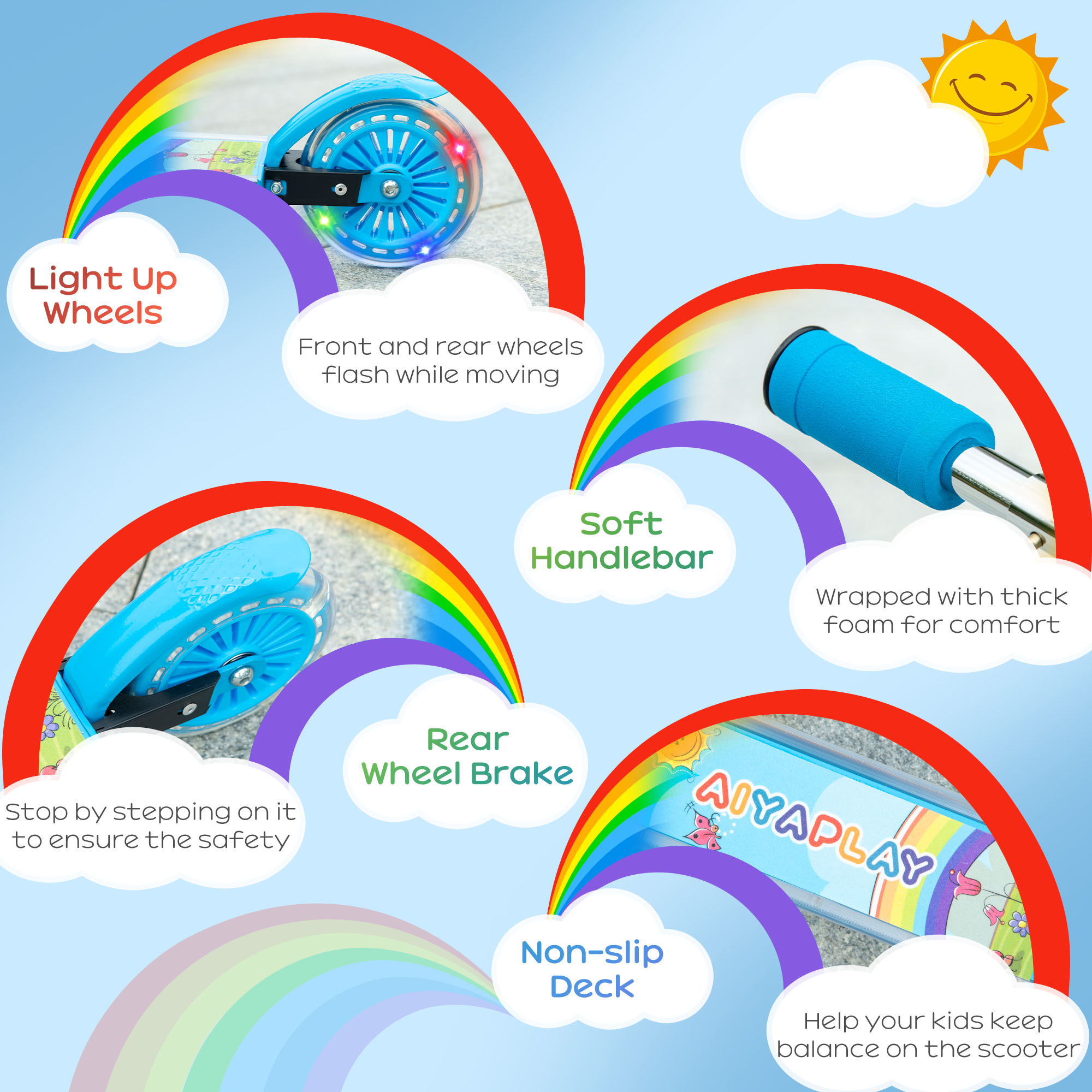 With this kids scooter, days out are extra special. As they ride, the wheels light up, whilst the LED around the foot deck glow when the switch is on. There's also built-in music, which adds to the fun. With adjustable handlebars and a durable metal frame, it's suitable for long term use – as your child grows, so will the kids scooter. It's wrapped with thick foam, making it comfortable to hold. Finished with a rear brake, which brings it to a swift stop; a safe way for endless enjoyment.