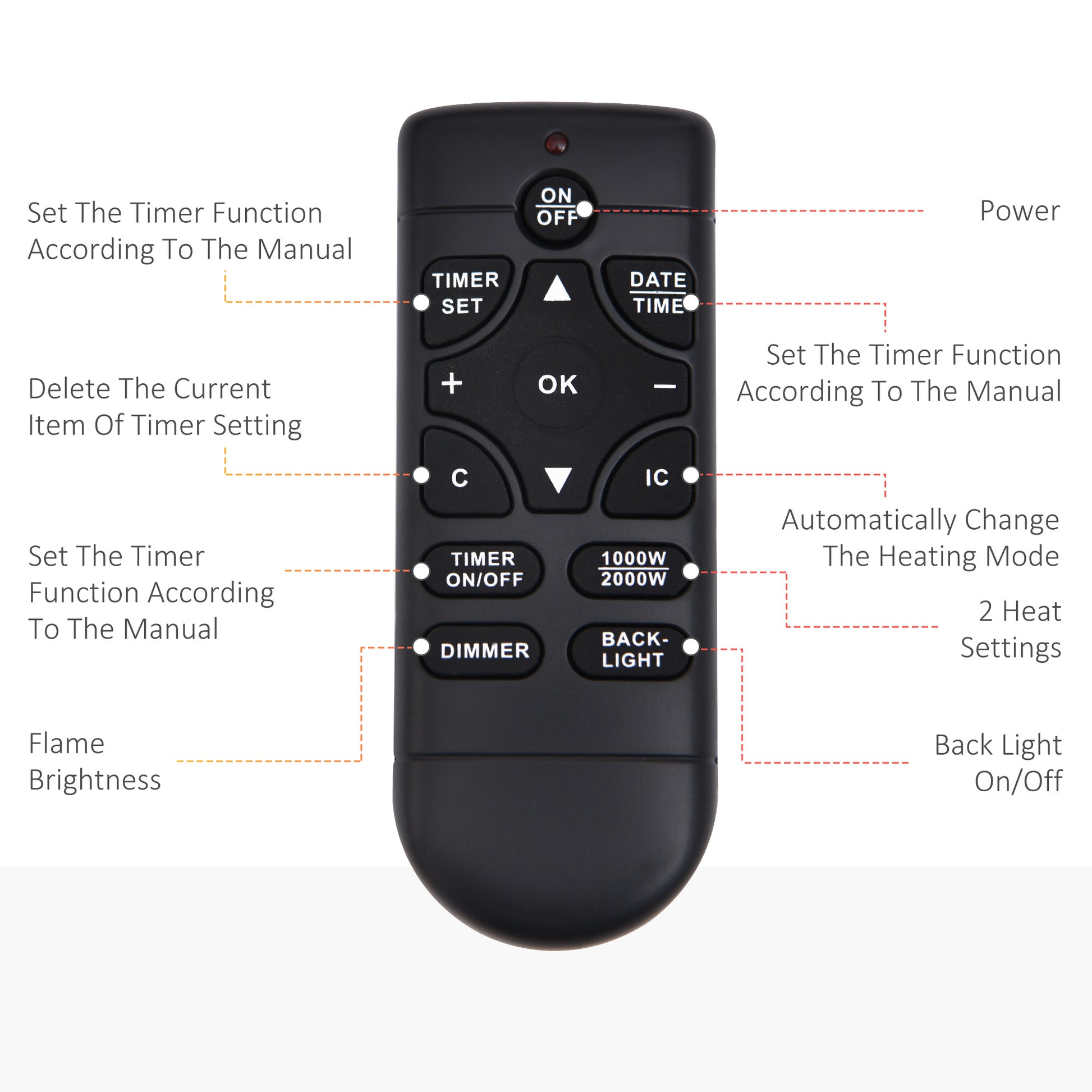 - Remote control including on/off, heat setting and dimmer