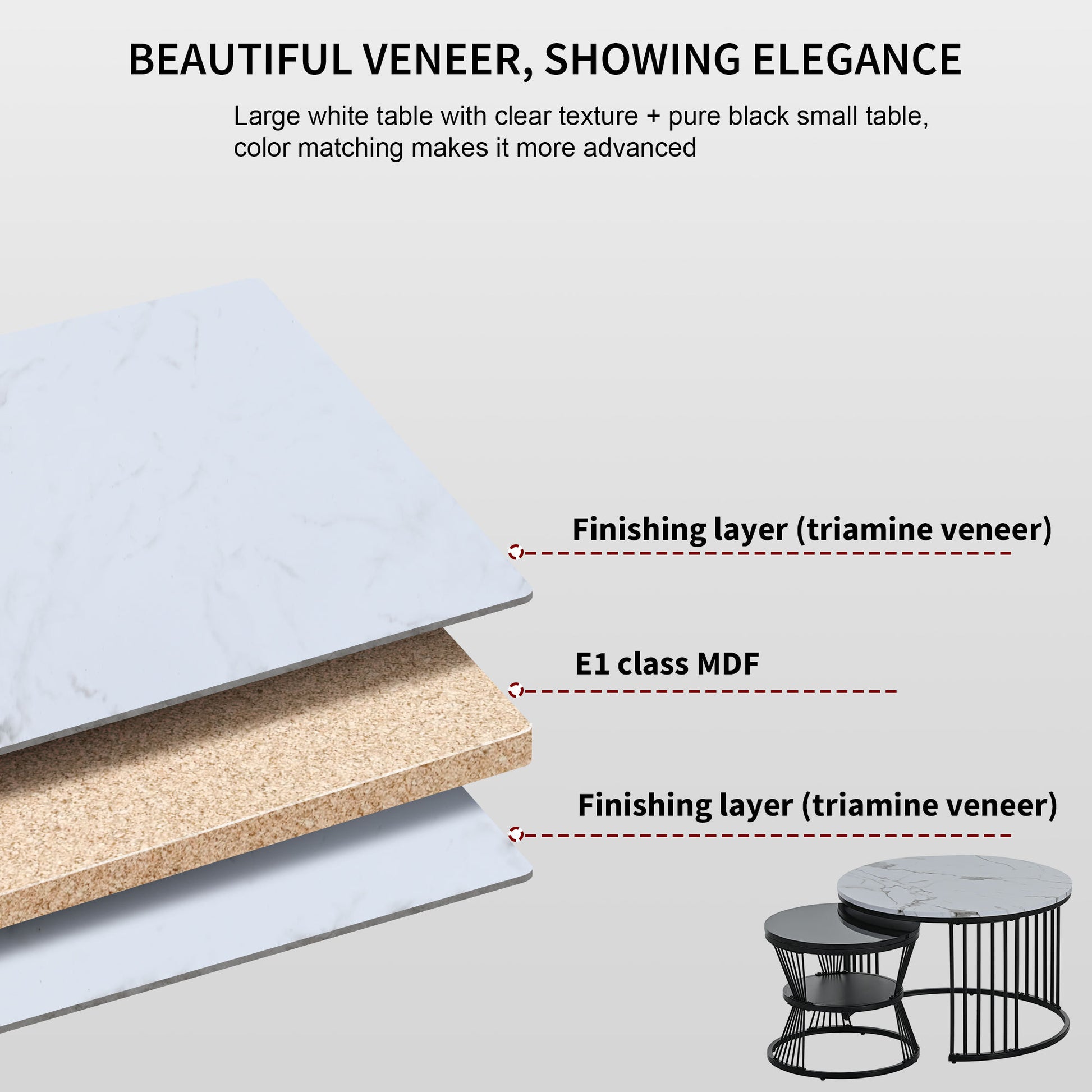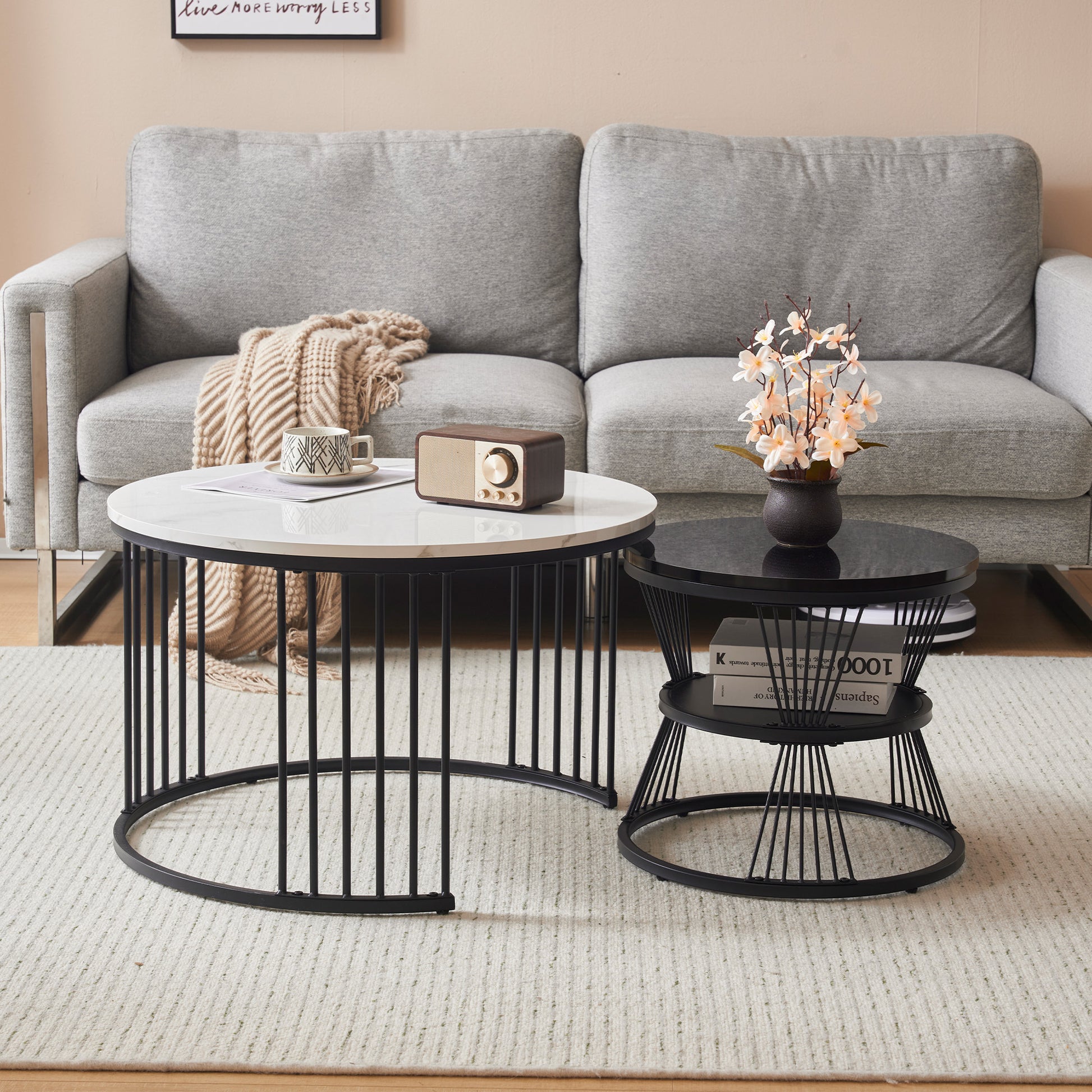 Helios Nesting Coffee Tables Set of 2 – Round Marble-Effect Top with Black Frame