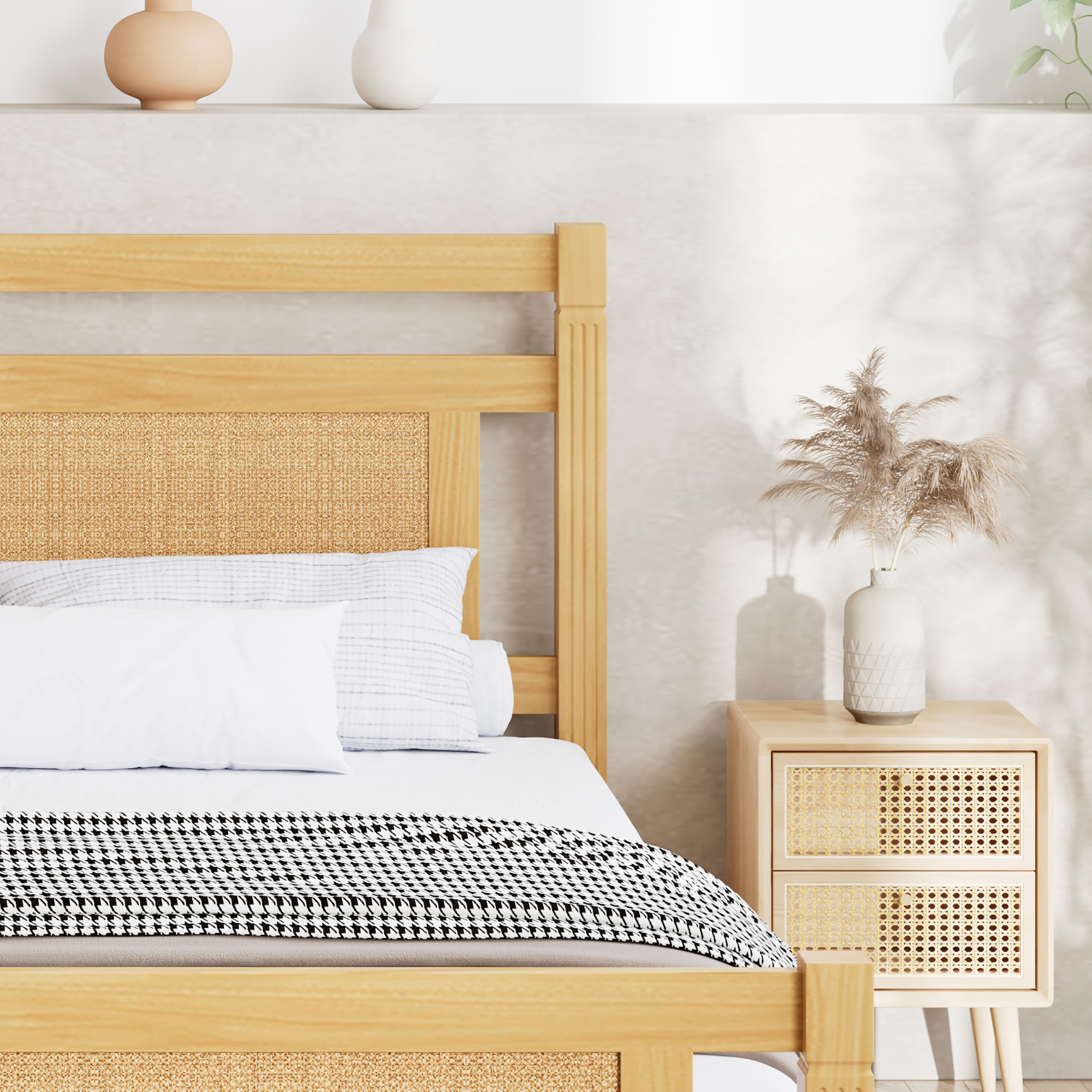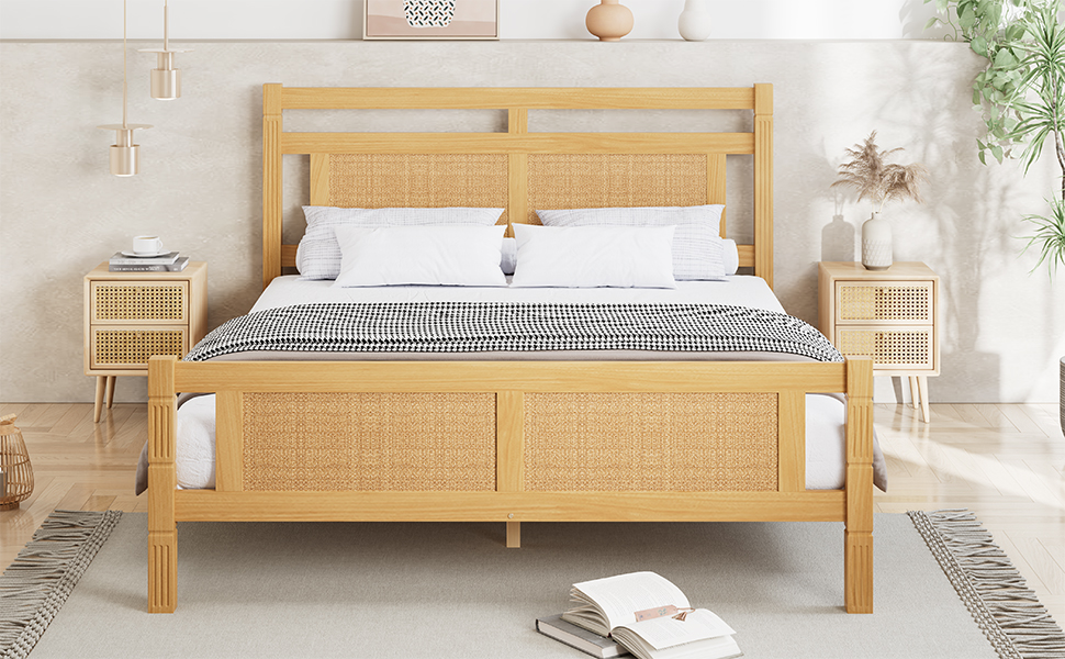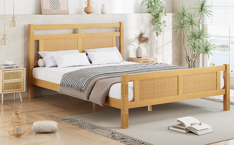 Product Name:Wooden bed, 4ft6 double bed 135×190cm, MDF with rattan paper, Sturdy bed slats, Pine+MDF+Plywood, Wood colour
